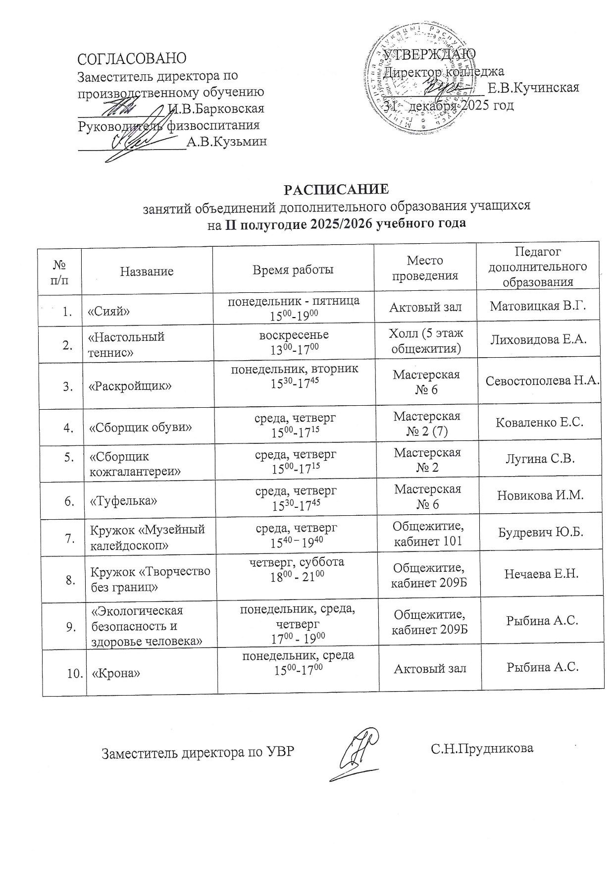 График работы педагогов-психологов и педагога социального в общежитии на II полугодие 2025/2026 учебного года