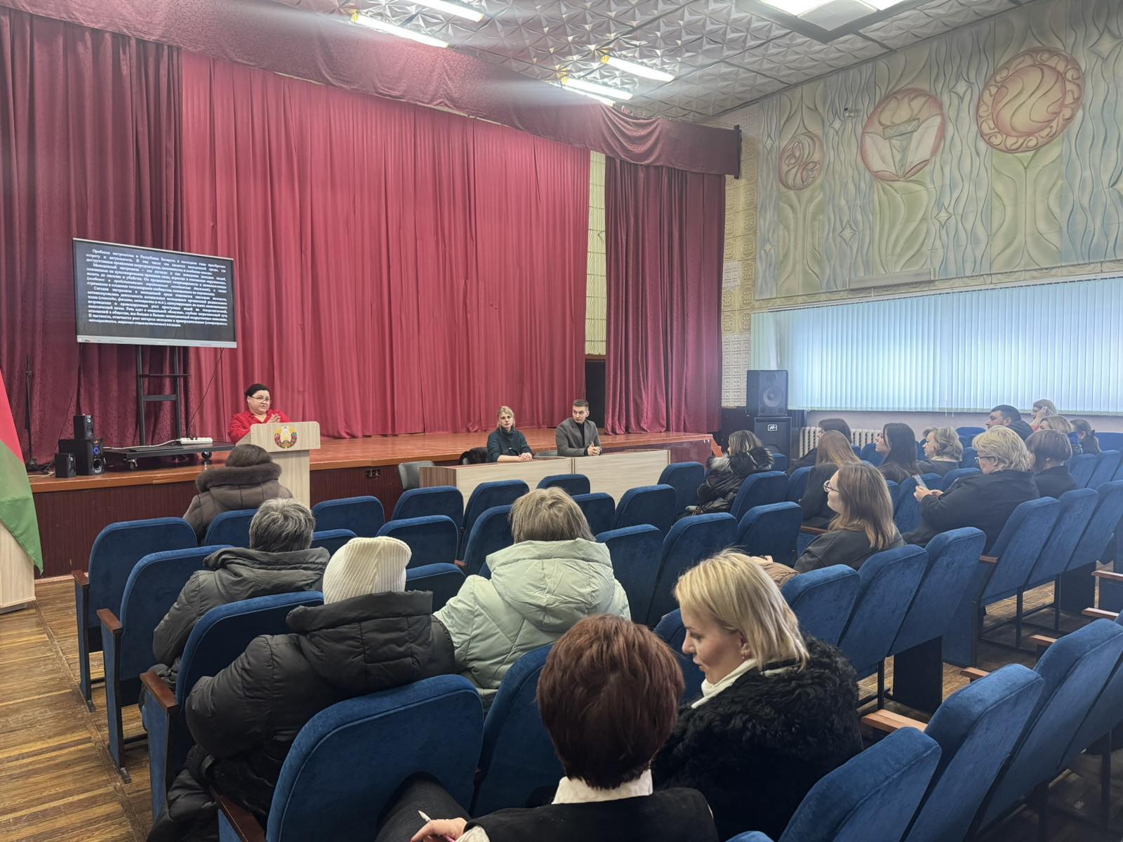 Перед родителями выступили представители профилактических служб Октябрьского района Витебска. Специалист социально-педагогического центра Гиско О.А. рассказала о профилактике насилия в отношении несовершеннолетних и разъяснила требования законодательства в данной сфере. Особое внимание было уделено алгоритмам взаимодействия родителей с государственными органами в случае возникновения угроз.