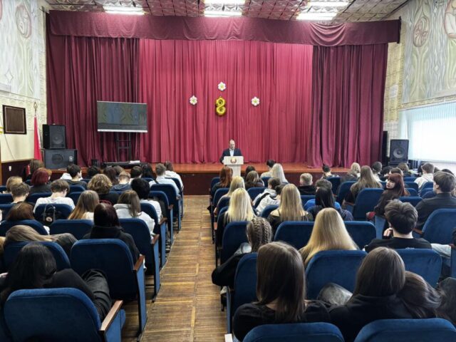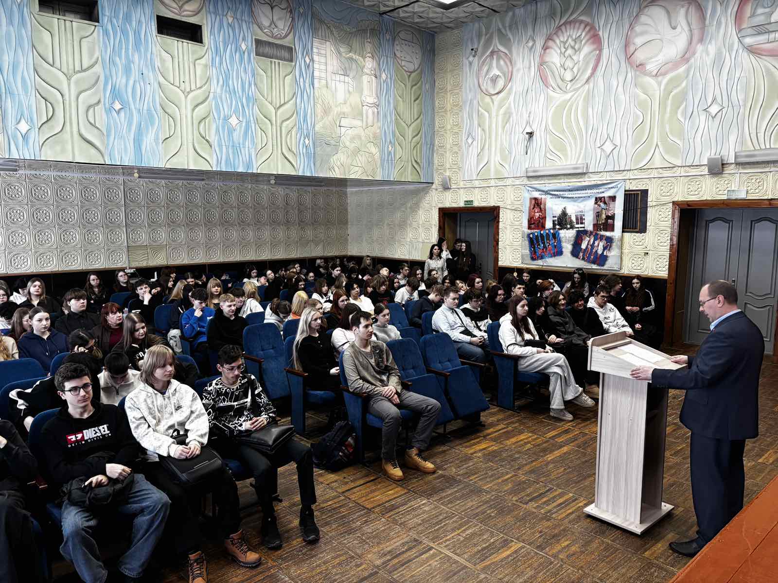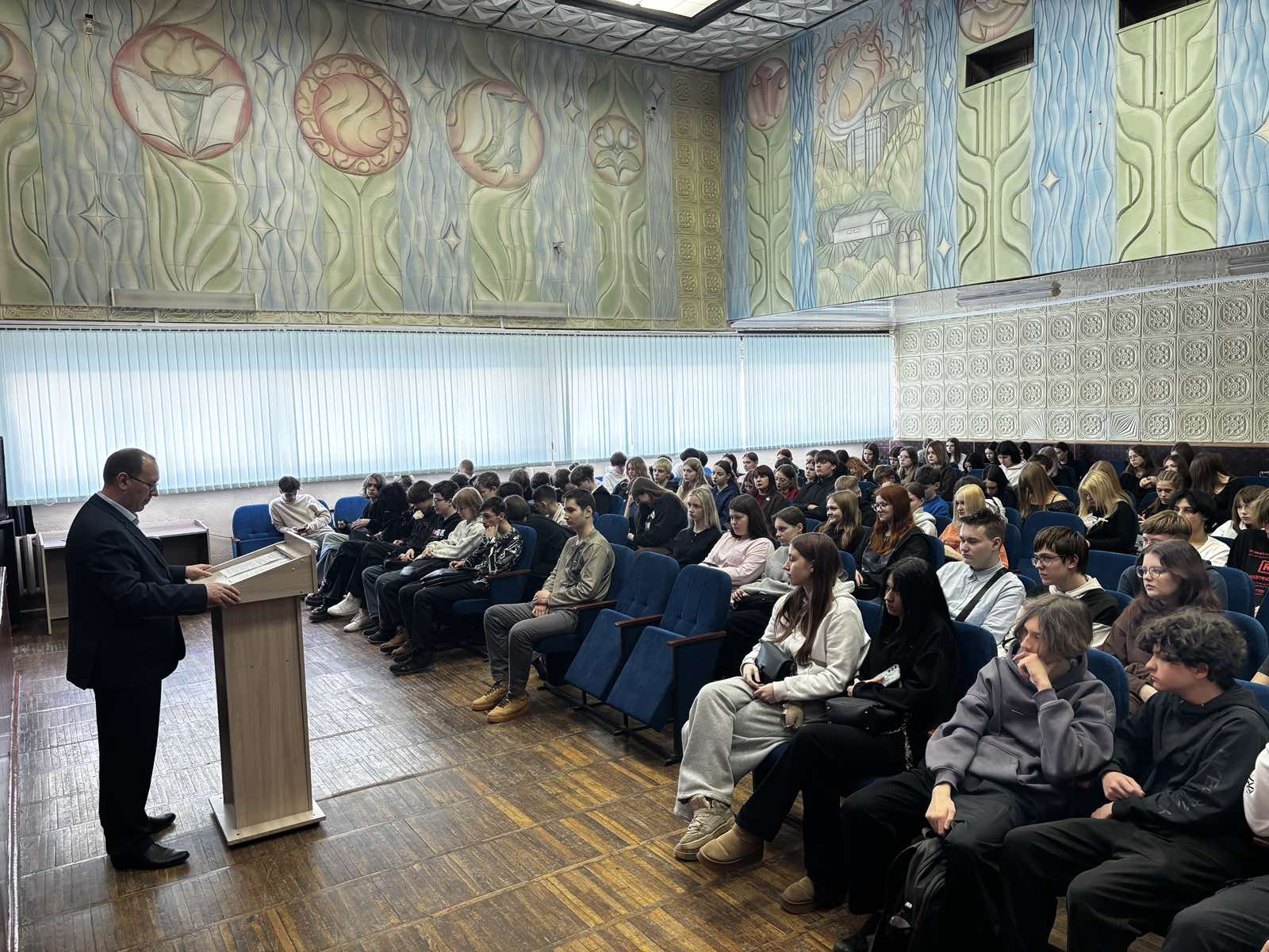 13 марта руководитель по военно-патриотическому воспитанию Ю.В. Насонов собрал учащихся в актовом зале, чтобы поговорить об основном законе нашей страны.